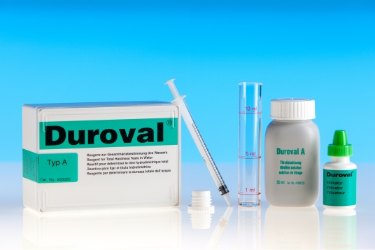 DUROVAL® TI Industriële testkit voor het bepalen van de waterhardheid over het gehele bereik via een complexometrische titratie met een vloeibaar titratie reagens en een pipet, nauwkeurig gekalibreerd in eenheden hardheid. De set wordt in het bijzonder aanbevolen als initieel equipment voor waterontharders. De testkit wordt compleet geleverd met een meetbuisje, een gekalibreerde pipet van 0-30 °dH, speciale sluitdop, vloeibare indicator en 50 ml titratie vloeistof. Met de set kunnen ongeveer 100 analyses uitgevoerd worden (met een gemiddelde hardheid van 15 °dH). De meettijd bedraagt ongeveer 2 minuten en de nauwkeurigheid is 0.5 °dH.